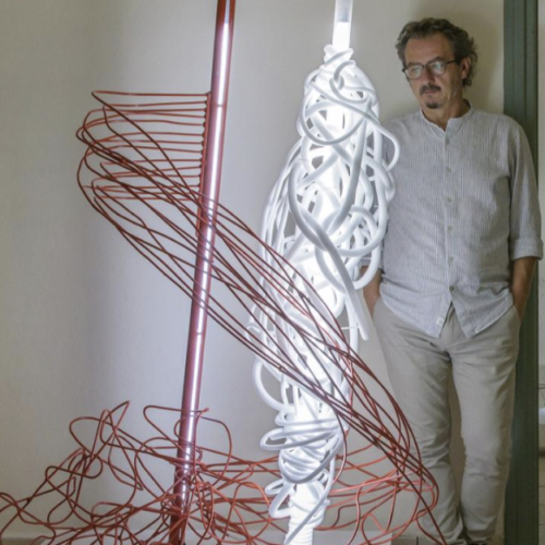 In the 2000s he presents wall structures and installations using aluminium, neon light, fluorescent lamps and plexiglas incorporating writing in order to reanimate the image as well as refer to the archetypal form of communication. Still he does not abandon painting which he uses partially, just like speech, so as to express feelings and lure the viewer into a game where life converses with death and art embraces technology.