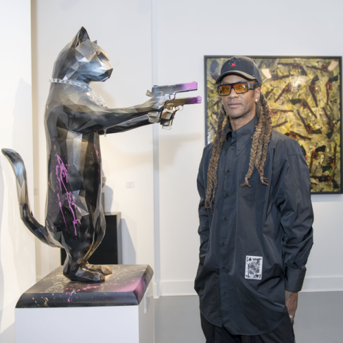 Maxim, The Prodigy front man and talented fine artist, has been with the band since its inception in 1990 and has toured all seven of their studio albums extensively around the world, picking up numerous awards along the way including MTV and NME accolades for recognition of their unique style and innovative music, as well as their chart success with countless hits. Maxim has more recently become known for his creativity as a contemporary artist under the pseudonym of MM (Double M). He has been creating paintings, multi-media collages, and sculptures for the last 20 years; his art has been featured on various home goods, such as bone China, and soon-to-be on candles, cushions, and wallpaper. Since 2012, he has displayed his mixed media artworks in various exhibitions across the world. MM is well known for his sinister, yet beautiful art. MM’s creative process tends to evolve naturally, without too much forward planning. He prefers to use the board as a base, as he enjoys being able to mutilate it and create chaos within the work. Often his works are finished with resin. He feels this gives a certain beauty and preciseness to the images, keeping them locked and untouchable behind the resin. He is self-taught and has been known to use many different random objects in his works, spray paints, bullets, blades, and pills to name a few. He also uses acrylic and ceramic paints, and anything he can get his hands on that will add to the texture of his work. The paintings are a journey into MM’s mind and have a surreal edge that takes you somewhere deep into his imagination. All of MM’s paintings contain signs of strength and positivity while putting a “spin on things” and seeing them from different angles. Grenades carried on the breeze by a raft of red balloons; skull-faced butterflies brandishing Samurai swords, and gun-toting cats are just a few of the surreal fantasy worlds created by MM. Since 2012 MM has supported various charities and donated artwork to raise money for research into Breast Cancer, BT ArtBox for ChildLine, Shelter, NHS Charities Together, Young Minds, and Chain of Hope (cardiac care for children around the world). Maxim currently lives and works in Essex, United Kingdom.